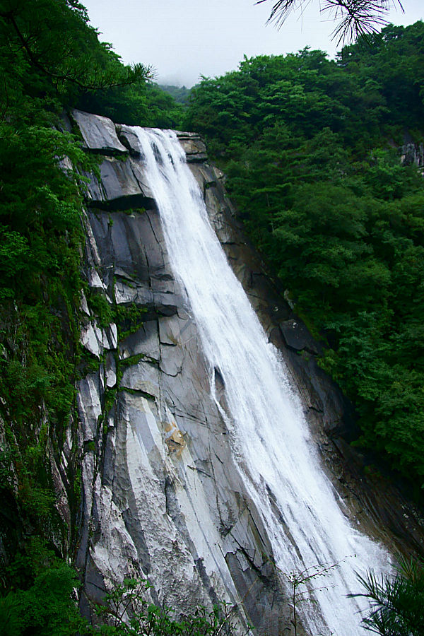 云霧山最美的是它的瀑布。云霧山瀑布由景區(qū)內(nèi)發(fā)源于留壩光頭山的沙河巨大的落差形成。沙河,發(fā)源于秦嶺深處小河,從海拔2600多米的光頭山出發(fā),跌宕起伏地演奏著自己的樂章。僅僅流淌四十多公里到云霧山,落差就達(dá)一千多米。在當(dāng)?shù)?,云霧山瀑布還有個(gè)令人發(fā)指的名字,“殺人坪瀑布”,足見其險(xiǎn)惡。一丈多寬的水幕從兩峰的埡口間奔瀉而下,在山崖上折了三折,落在河谷的深潭里,激起雪白的浪花,發(fā)出轟隆隆的響聲。三折的懸瀑落差超過200米,大氣磅礴,站在瀑布對面的觀景臺(tái)上,飛騰的水霧撲面而來,使人感到有些寒意。初夏雨量充沛,瀑布更加壯觀。站在位于瀑布第二折對面的觀瀑臺(tái)上,飛濺的水珠似濛濛細(xì)雨,片刻便會(huì)打濕游客的衣衫。與云霧山瀑布相比,九寨溝的諾日朗瀑布只能算是個(gè)精致的小盆景。云霧山瀑布無論是水量、寬度,還是落差,都超過了廬山三疊泉瀑布。