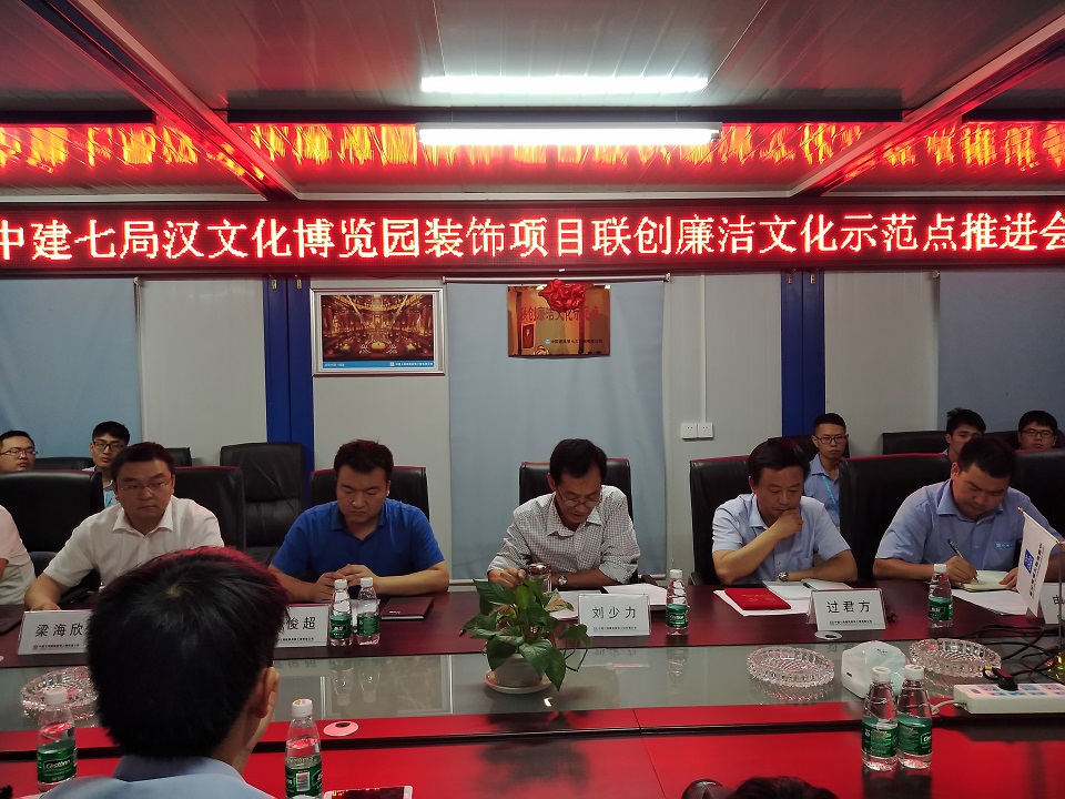 漢文投訊 2017年9月14日,漢文化博物館裝飾項目召開聯(lián)創(chuàng)廉潔文化示范點推進會,漢文投集團公司黨委副書記兼紀委書記劉少力、中建七局裝飾指揮長菅俊超、江蘇無錫華誠監(jiān)理有限公司總經(jīng)理助理兼工程部總經(jīng)理過君方出席會議。