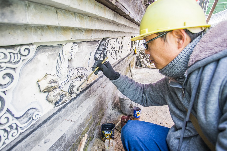 栩栩如生的飛翹屋檐、蜿蜒勾勒的精致壁面,一座座彩色花鳥魚蟲灰雕完整再現(xiàn)了閩南地區(qū)古色古香的建筑裝飾。沿著老街深入其中,建設(shè)者們正有條不紊地忙碌著,筆者有幸遇見了來自福建泉州惠安縣的灰塑大師蔡榮宗。今年45歲的蔡師傅,正蹲在屋脊一側(cè)忙著創(chuàng)造一幅灰塑。