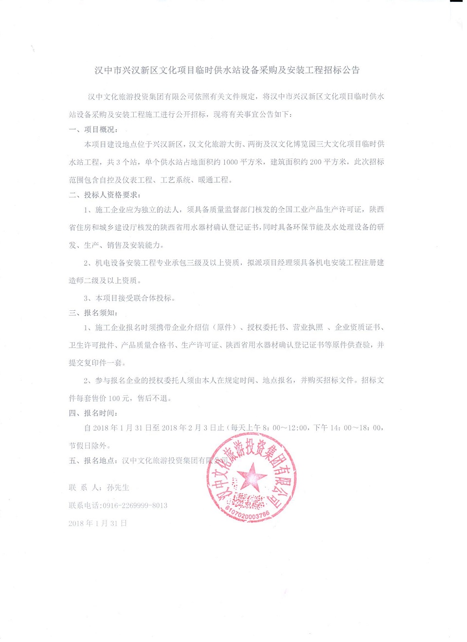 漢中文化旅游投資集團有限公司依照有關文件規(guī)定,將漢中市興漢新區(qū)文化項目臨時供水站設備采購及安裝工程施工進行公開招標,現(xiàn)將有關事宜公告如下: