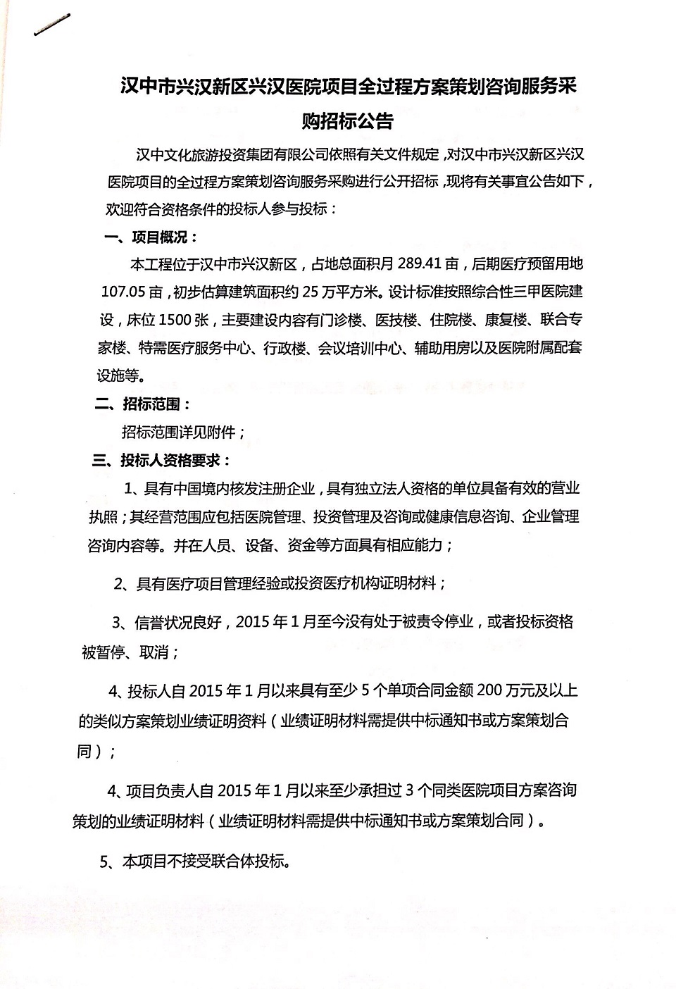 漢中文化旅游投資集團有限公司依照有關文件規(guī)定,對漢中市興漢新區(qū)興漢醫(yī)院項目的全過程方案策劃咨詢服務采購進行公開招標,現(xiàn)將有關事宜公告如下,歡迎符合資格條件的投標人參與投標: