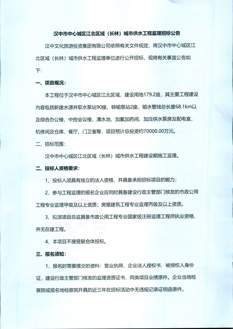 漢中文化旅游投資集團有限公司依照有關文件規(guī)定,將漢中市中心城區(qū)江北區(qū)域(長林)城市供水工程監(jiān)理單位進行公開招標,現(xiàn)將有關事宜公告如下: