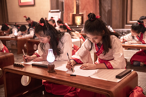 一首配樂朗誦《重回漢唐 禮儀之邦》拉開了“漢臺區(qū)中小學(xué)生研學(xué)實(shí)踐教育活動啟動儀式”的序幕。 研學(xué)導(dǎo)師給孩子們教授了漢代禮儀,孩子們認(rèn)認(rèn)真真的聽,仔仔細(xì)細(xì)的學(xué)。隨后,孩子們跟隨研學(xué)導(dǎo)師游覽了漢樂府九方印展館、漢文化博物館的先圣堂、先賢堂,聽導(dǎo)師講說著展館里陳列的雕像的人物故事,眼前肅穆端莊的人像,合著導(dǎo)師的解說,孩子們聽得津津有味,頻頻點(diǎn)頭。參觀完文化展館,孩子們又來到漢字廊和漢語廊,席地而坐,體驗(yàn)古人伏案書寫漢字的樂趣。
