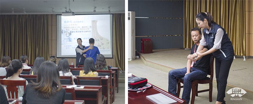 針對集團員工室內(nèi)戶外工作兼具的情況,王欣圍繞心肺復(fù)蘇急救知識、心理健康、辦公室常見職業(yè)病、環(huán)境污染對個人身體健康的影響等方面進行講解。還通過相關(guān)經(jīng)絡(luò)穴位知識,向?qū)W員們講授了日常保健技巧。課堂上,學(xué)員積極與講師進行演示互動,在輕松活躍的氣氛中了解和掌握了自我健康管理的知識。