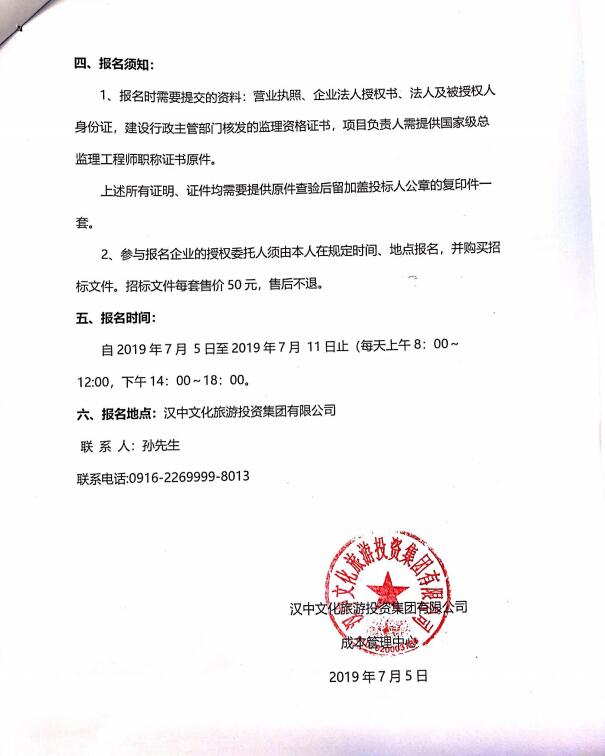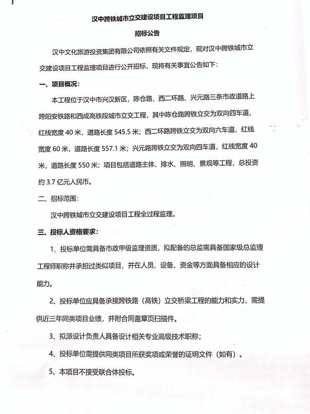 漢中文化旅游投資集團(tuán)有限公司依照有關(guān)文件規(guī)定,現(xiàn)對漢中跨鐵城市立交建設(shè)項目工程監(jiān)理項目進(jìn)行公開招標(biāo),現(xiàn)將有關(guān)事宜公告如下: