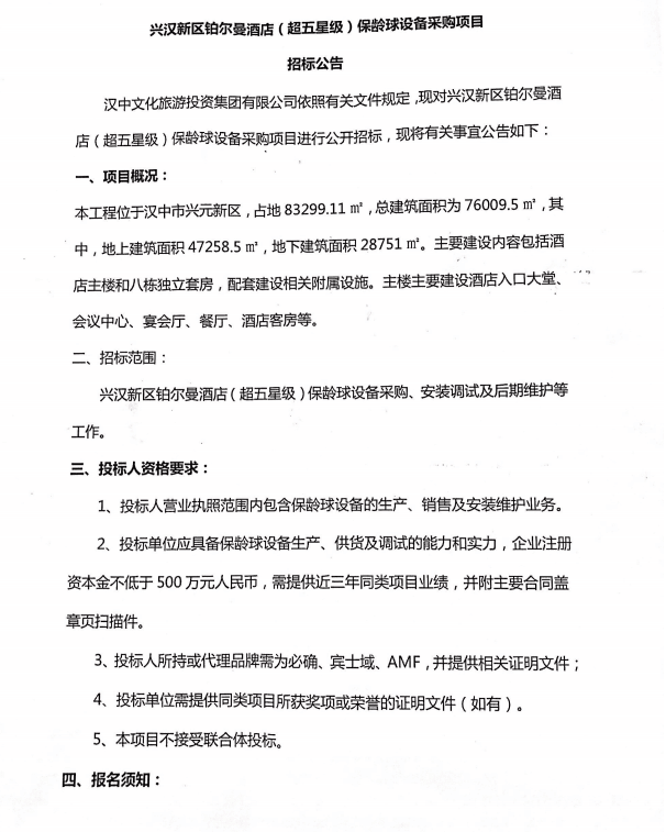 漢中文化旅游投資集團(tuán)有限公司依照有關(guān)文件規(guī)定,現(xiàn)對(duì)興漢新區(qū)鉑爾曼酒店(超五星級(jí))保齡球設(shè)備采購(gòu)項(xiàng)目進(jìn)行公開招標(biāo),現(xiàn)將有關(guān)事宜公告如下: