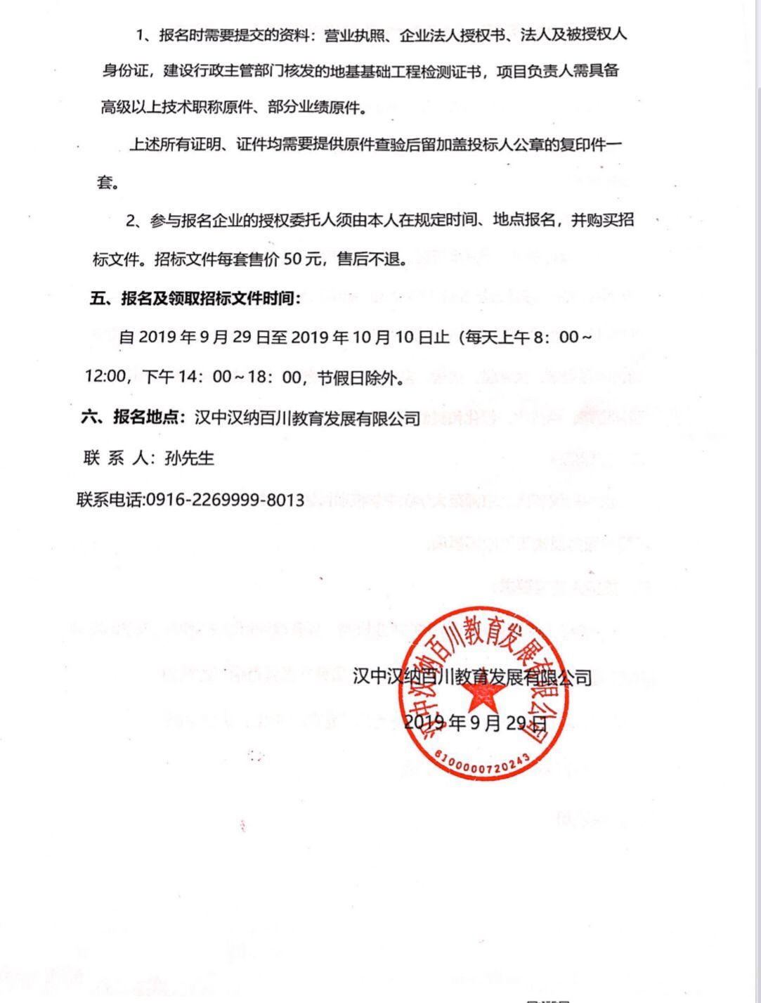 漢中漢納百川教育發(fā)展有限公司依照有關(guān)文件規(guī)定,現(xiàn)對(duì)漢中市興漢新區(qū)北京師范大學(xué)漢中學(xué)校項(xiàng)目管樁承載力檢測(cè)工程進(jìn)行公開招標(biāo),現(xiàn)將有關(guān)事宜公告如下: