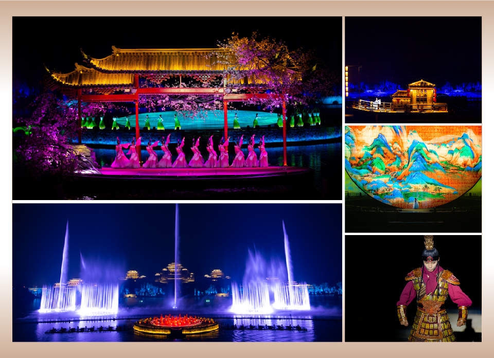 演出采用國際領(lǐng)先舞臺(tái)技術(shù),由3000平米亞洲巨型全息水幕,4500個(gè)水下彩燈,200架新型無人機(jī)陣列“星空”,150米長亞洲巨型實(shí)景“火龍”,100米高亞洲巨型高噴“水龍”,300秒震撼水上煙花秀,巨型皇家船隊(duì),3維高科技全變頻噴泉矩陣和燈光、水舞等技術(shù)設(shè)備組成,伴著興漢勝境漢文化博覽園作為舞臺(tái)背景,漢源湖畔,夜幕低垂之際、湖面光彩四射,200多名演員在漢源湖水面上傾情表演,形成了一個(gè)美輪美奐的虛幻與實(shí)景完美結(jié)合的效果,演繹成為一個(gè)空前輝煌的大漢盛世,給游客展現(xiàn)出一幅漢文化的動(dòng)人傳奇畫卷!