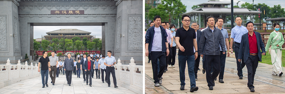 17日,許峰一行來到興漢新區(qū)核心漢文化景區(qū)——興漢勝境,詳細(xì)考察了興漢城市展覽館、漢文化博物館及漢樂府。他表示漢文化博覽園各大建筑特色鮮明,精雕細(xì)琢,興漢新區(qū)堅持文旅融合發(fā)展,深入挖掘與弘揚(yáng)漢中豐富漢文化歷史積淀的做法值得贊揚(yáng)和借鑒。