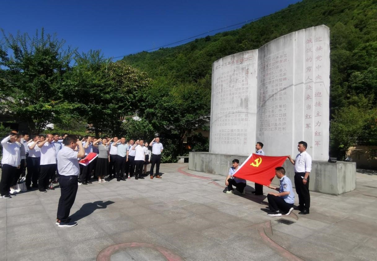 活動第一站來到紅二十五軍軍部舊址,面對紀念碑和鮮艷的黨旗,全體黨員重溫入黨誓詞,深切緬懷革命先烈。