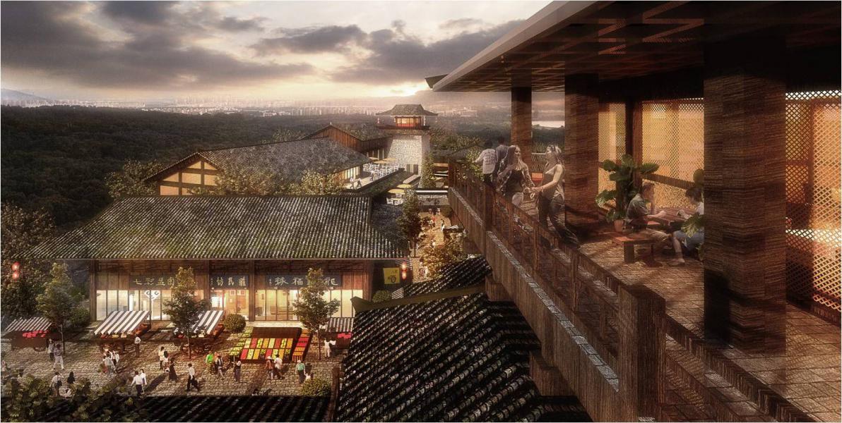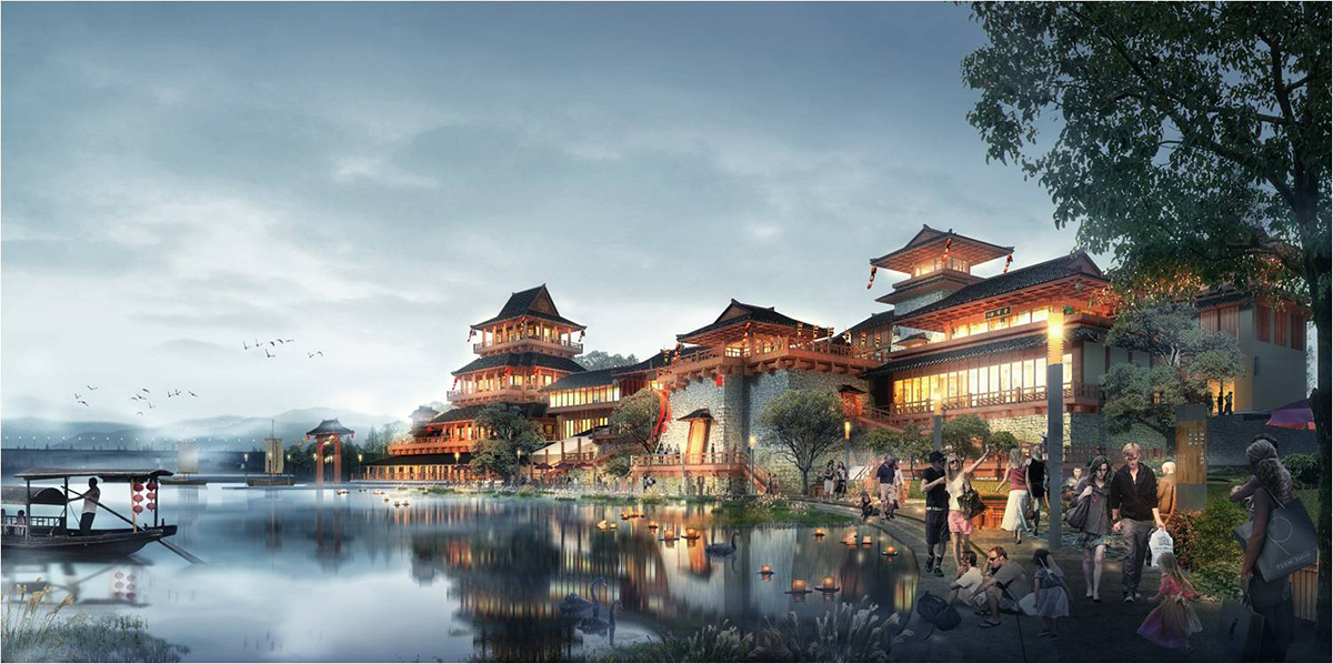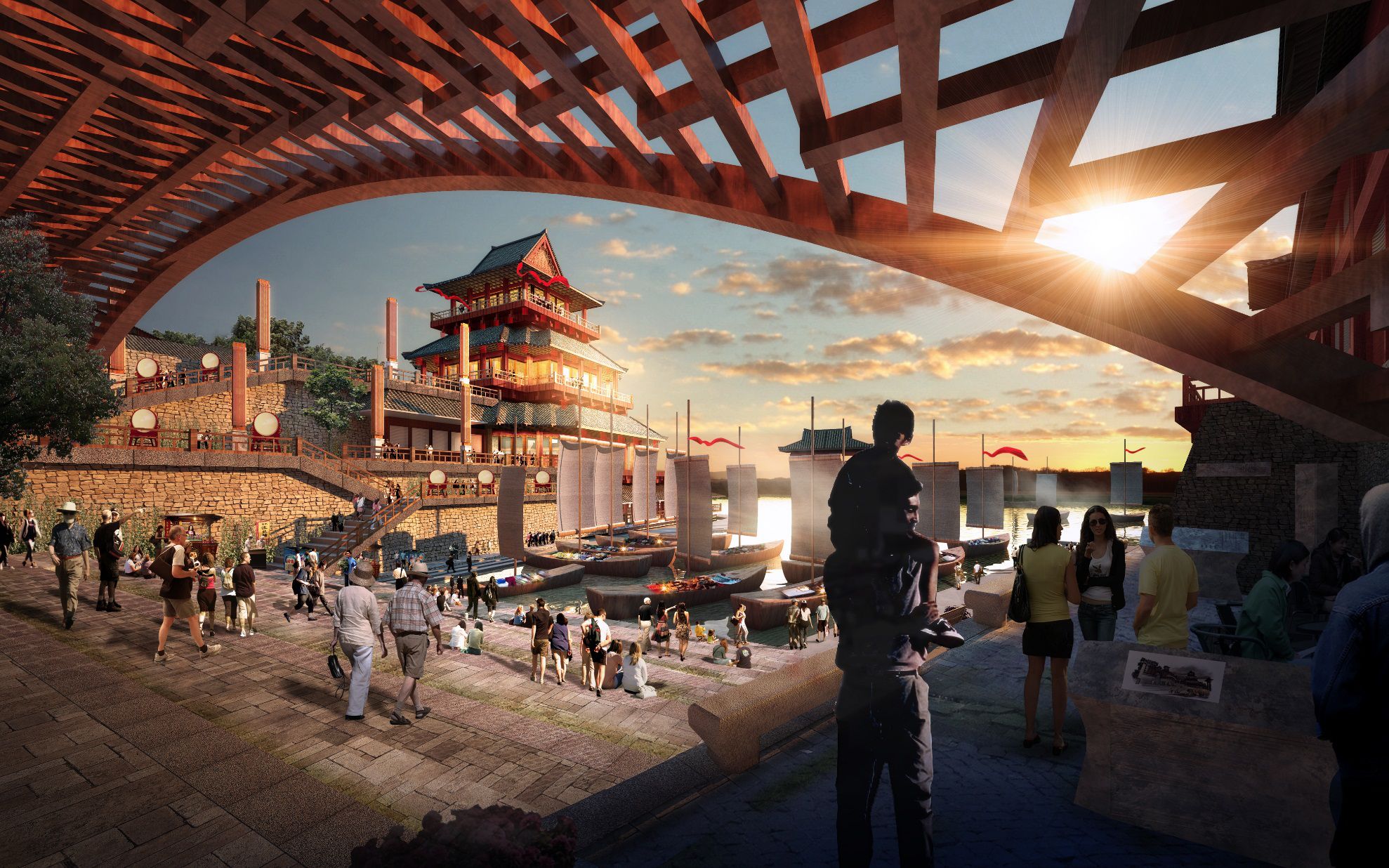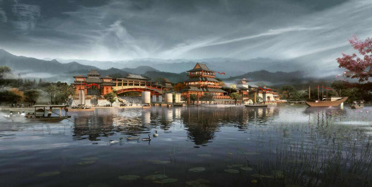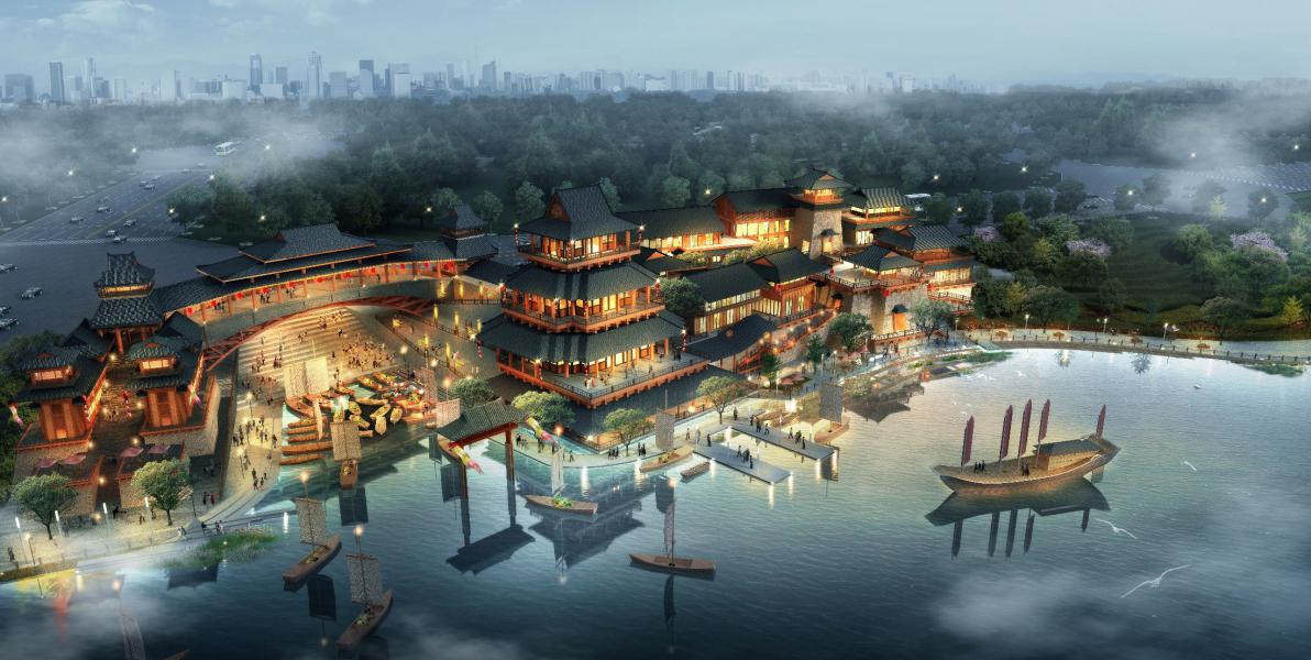設計理念以“楚風漢韻”貫穿整個規(guī)劃設計過程,主要建筑以古蘭臺、子胥臺、陽春臺、白雪樓為借鑒,在白雪樓可遠眺漢宮,近看河景。