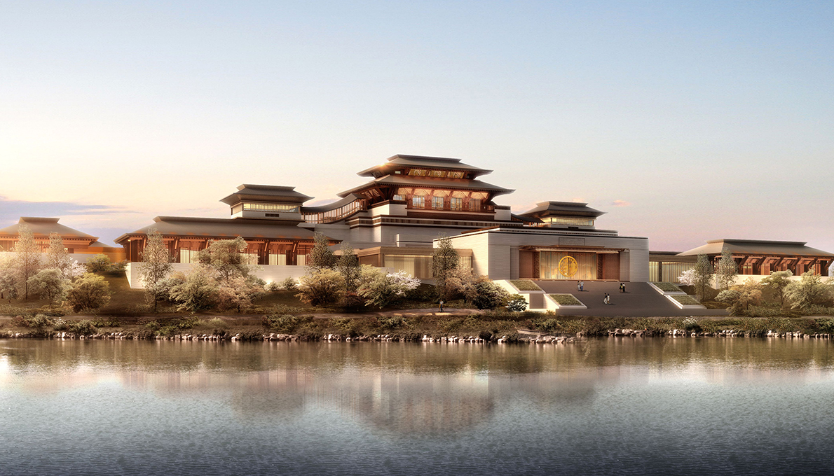 漢樂府位于漢文化博覽園的西南側,用地面積約2.92萬平方米。漢樂府是作為漢文化博覽園的重要服務配套進行設計的, 以展示漢代歌舞和宴飲文化為主要功能。它分為舞、樂、宴三個主題區(qū)域,其中“宴”主題區(qū)域用以演繹大漢傳統(tǒng)宴飲文化;“樂”主題區(qū)域作為漢樂府經(jīng)典音樂會堂,并設有包廂,不同的命名代表不同地方風格;“舞”主題區(qū)域將作為大型文化主題歌舞盛宴使用。