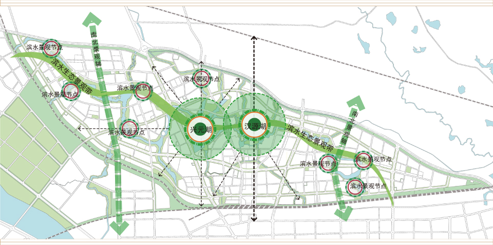 興漢新區(qū)從保護(hù)生態(tài)環(huán)境的角度出發(fā),尊重自然,在充分利用土地資源的基礎(chǔ)上,最大限度地保護(hù)區(qū)域內(nèi)的水域、地形地貌,建立水、路、建筑相結(jié)合的綠色生態(tài)系統(tǒng),將城市建設(shè)、旅游開(kāi)發(fā)與生態(tài)保護(hù)相結(jié)合,形成合理的開(kāi)發(fā)建設(shè)時(shí)序。
