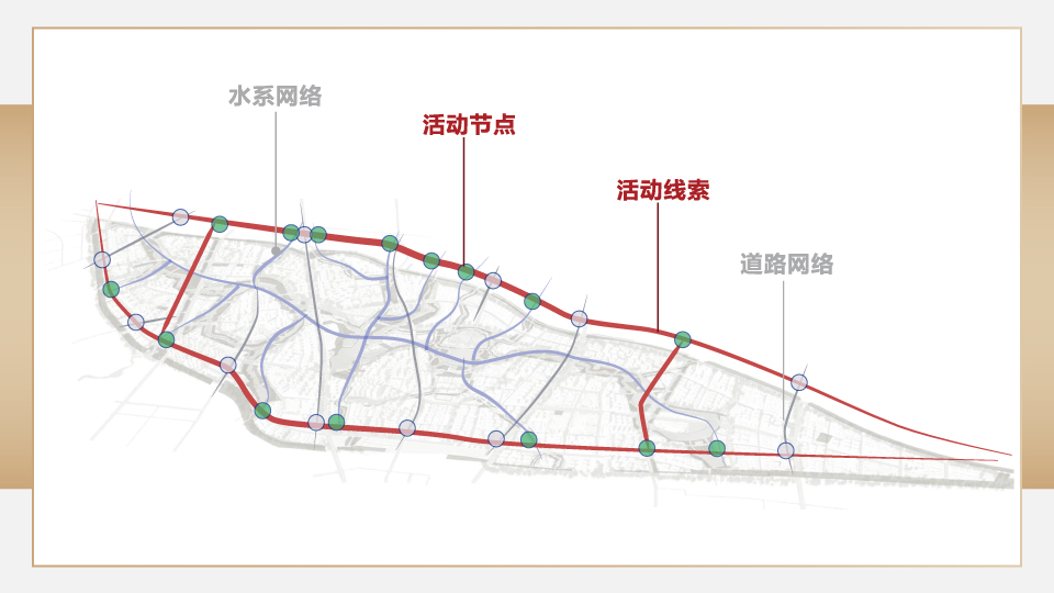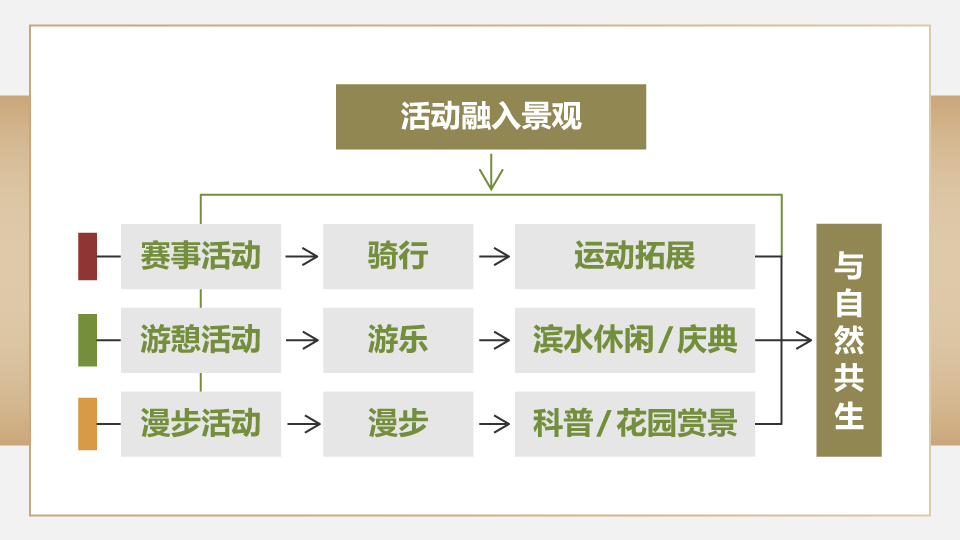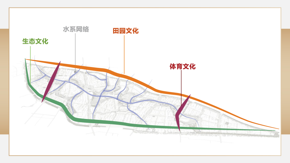 融入田園、生態(tài)、體育文化主題,結(jié)合現(xiàn)狀水系景觀網(wǎng)絡(luò),形成多元的城市公共活動(dòng)文化主題帶。