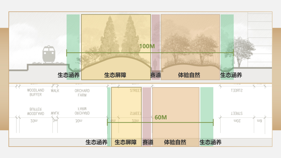 通過(guò)城市生態(tài)服務(wù)功能的引入,打造生態(tài)屏障、生態(tài)涵養(yǎng)、體驗(yàn)自然文化主題、城市活動(dòng)帶四大功能組合的自然文化景觀帶。