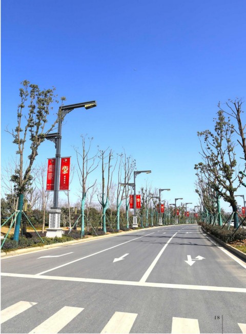 灌木、矮墻、鋪地形成動(dòng)感十足的道路風(fēng)格。北側(cè)有綠帶,南側(cè)為河道景觀帶。道路設(shè)